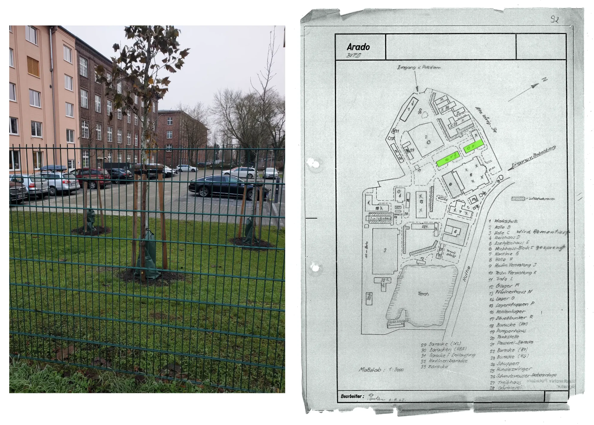 Vor dir stehen zwei alte Gebäude.Auf dem alten Plan vom Arado-Werk sind sie grün.Das eine Haus hat einen rosa Anbau.Der Anbau ist nicht aus der Arado-Zeit.