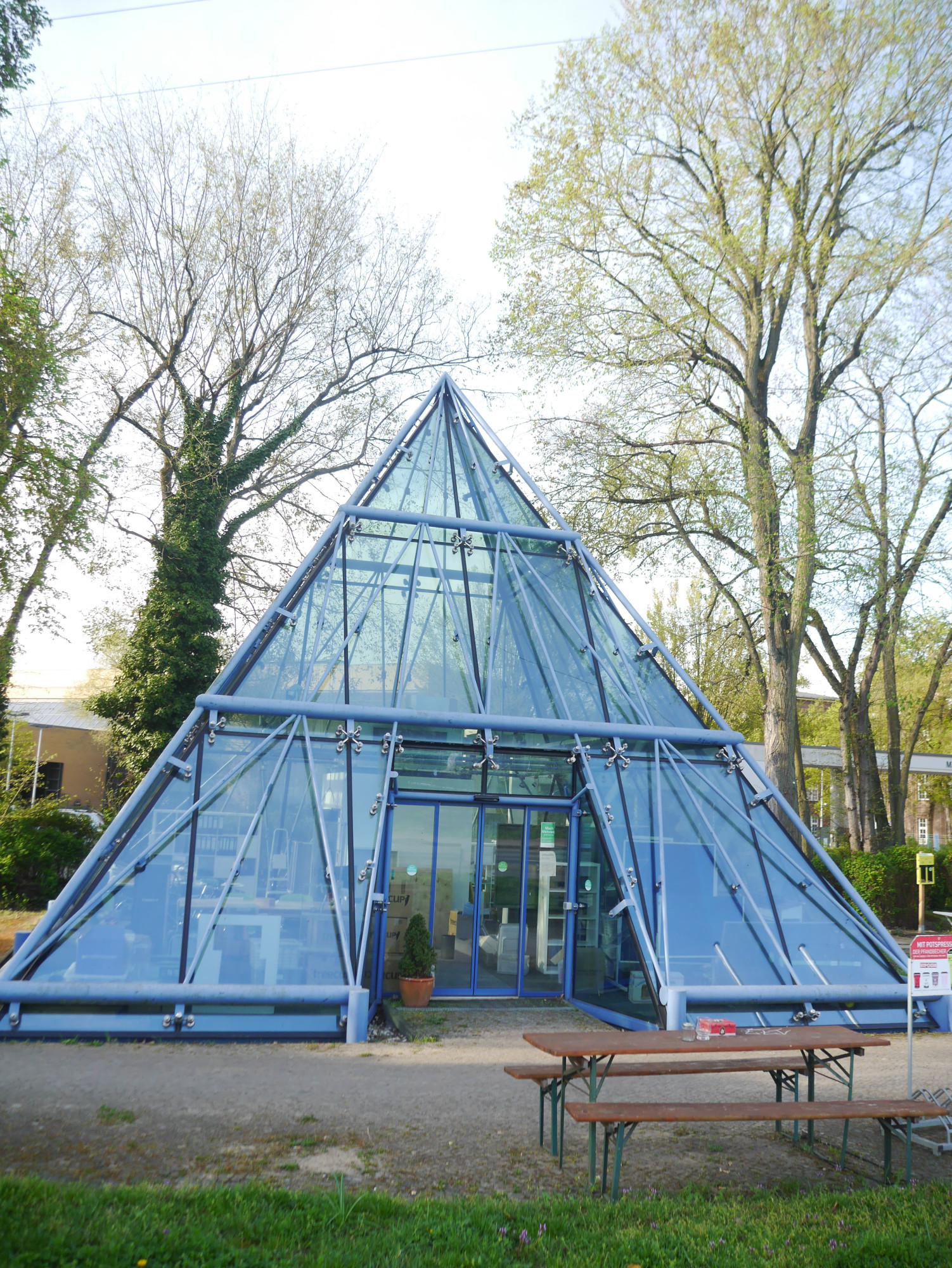 Gehe jetzt weiter bis zur Pyramide aus Glas.